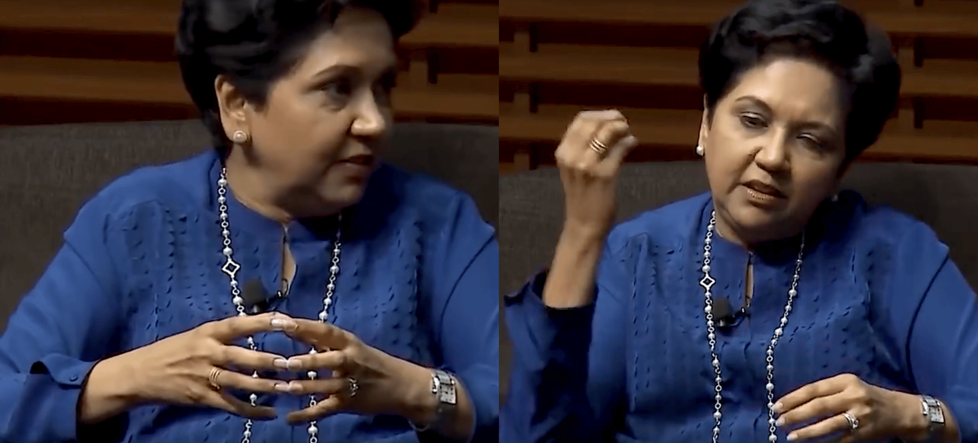 Indra Nooyi (left, the former CEO of PepsiCo) speaking at the Stanford GSB in 2016. Her full interview HERE was practically flawless from an impromptu speaking perspective.