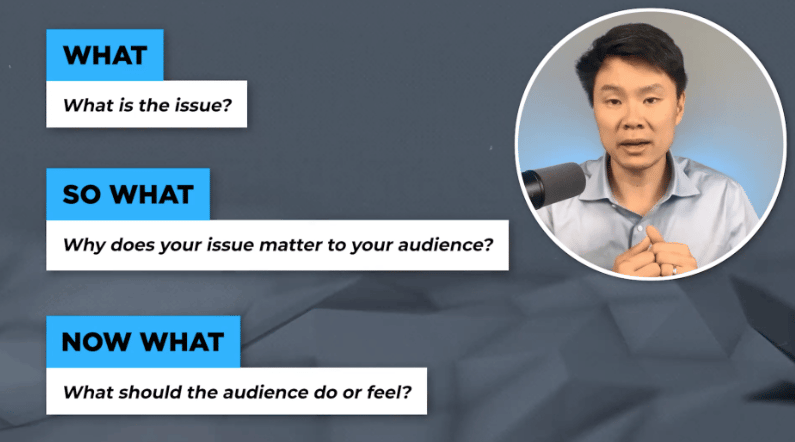 The What / So What / Now What framework is a great framework to keep yourself organized when speaking on the spot. Learn more about the framework HERE.
