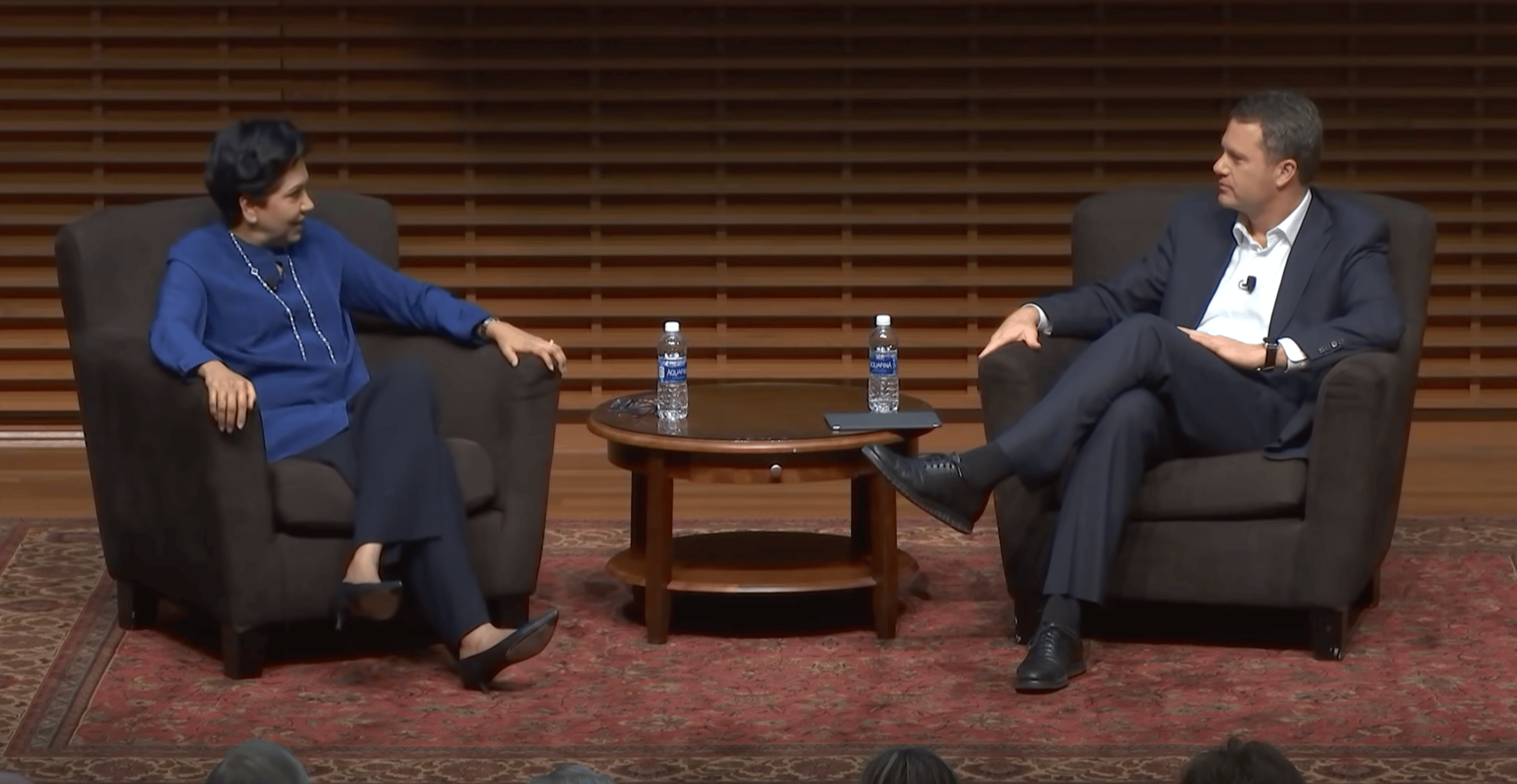 Indra Nooyi (left, the former CEO of PepsiCo) speaking at the Stanford GSB in 2016. Her full interview HERE was practically flawless from an impromptu speaking perspective.