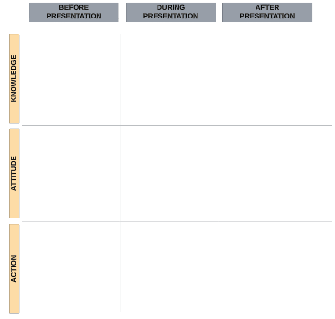 - KNOWLEDGE: How will your audience’s knowledge of the topic change over the course of your presentation?