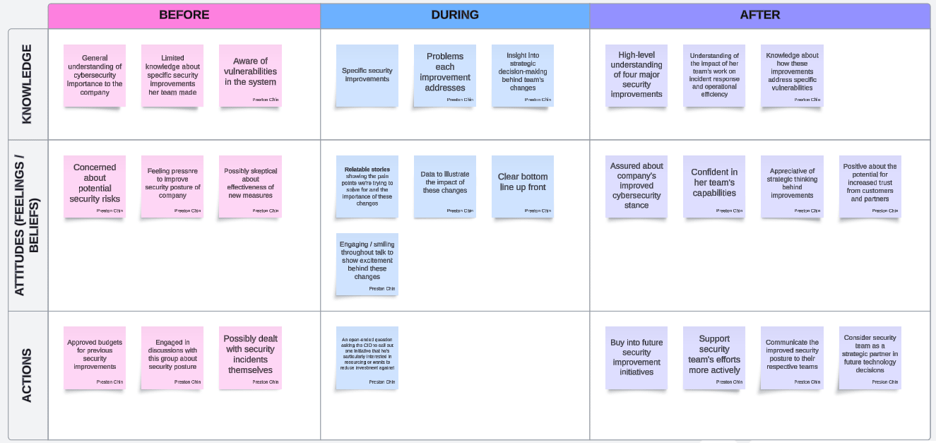 This is roughly a ~10 to 20-minute exercise that will save you hours of time when crafting your message. You can see a picture of what it looked like for my client, a cybersecurity director presenting an update to executive team below: