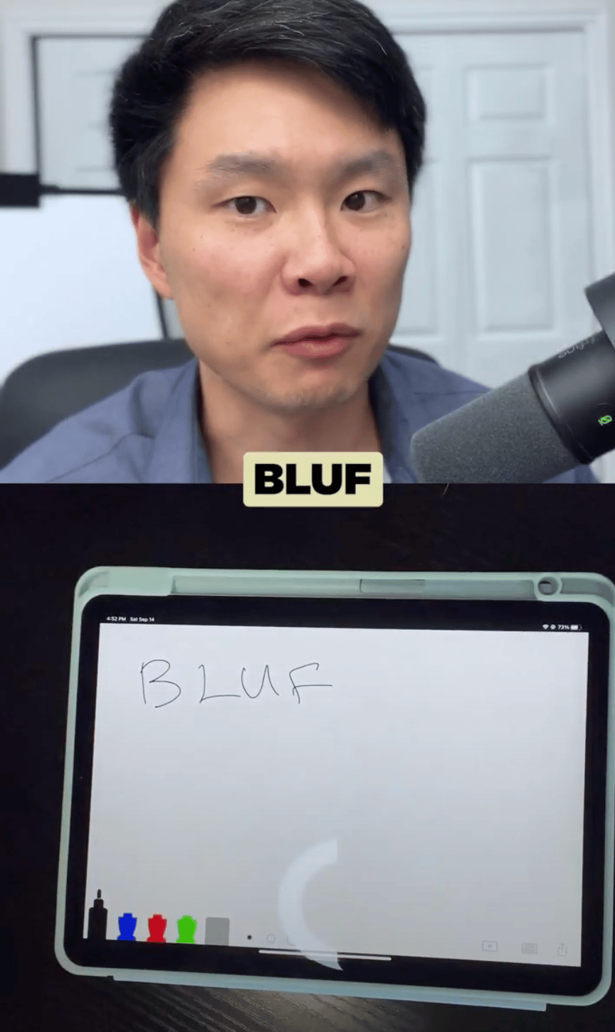 I walk through a 3-step process for how to give your BLUF in this Instagram reel. Note the last point on how I lower my tone.